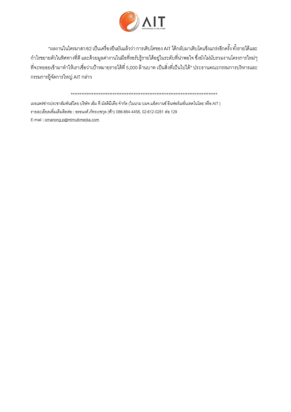 AIT โชว์ฟอร์มสวยกำไรไตรมาส 1/62 แตะ 114 ล้านบาทเติบโต 50% เดินหน้าส่งมอบงานใหญ่มั่นใจรายได้ปี 62 โตตามเป้า